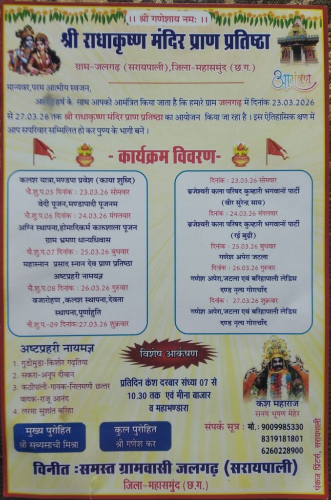 सरायपाली क्षेत्र के ग्राम जलगढ़ में श्रद्धा, भक्ति और सांस्कृतिक उत्साह का अद्भुत संगम देखने को मिल रहा है, जहां श्री राधा-कृष्ण मंदिर के प्राण प्रतिष्ठा महोत्सव का भव्य आयोजन किया जा रहा है। यह महोत्सव पूरे क्षेत्र के लिए आस्था और उत्सव का केंद्र बना हुआ है, जिसमें बड़ी संख्या में श्रद्धालु एवं ग्रामीणजन उत्साहपूर्वक भाग ले रहे हैं।